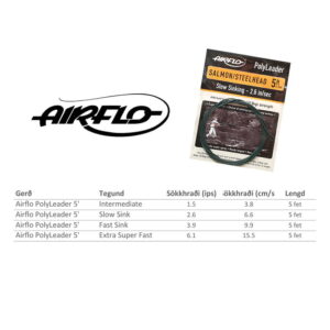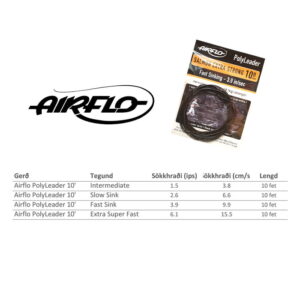 PolyLeader eru sökkendar frá Airflo sem fást í fjórum útfærslum, hver með sinn sökkhraða. Endarnir eru 10 fet að lengd og henta á tvíhendur í lax- og silungsveiði. Sökkendarnir eru einföld og árangursrík leið til að koma flugunni hraðar niður til fisksins. Áföst lykkja er á öðrum enda taumsins.