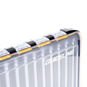 Stór vatnshelt flugubox frá Guideline með miklu geymsluplássi á báðum hliðum. Þetta er kjörið safnbox til að hafa í bílnum eða bakpokanum. Stærðin er 295×210 mm, næstum eins og A4 pappírsblað. Þykktin er 54 mm og þyngdin 893 grömm. Það eru 11 rifflaðar raðir á hvorri hlið, hver röð er með 32 rifum fyrir hverja flugu. Þetta gefur samtals 352 rifur á hlið eða 704 fyrir fluguboxið í heild.