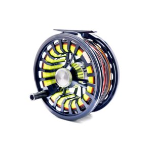 Hjólið er uppsett með undirlínu og Hofsá flotlínu, sem er samfellt hönnuð tvíhendulína þar sem rennilína og skothaus mynda eina heild. Hún er hugsuð fyrir veiðimenn sem vilja jafnvægi, afl og fínlega framsetningu í sömu línu. Hofsá rís hátt, kastar átakalítið og leggst mjúklega á vatnið – fullkomin fyrir aðstæður þar sem nákvæmni skiptir öllu. Hún nýtist bæði með smáum og stærri flugum og hentar jafnt í veltiköst sem yfirhandarköst. Línan er í látlausum grænum lit að framan og skærri appelsínugulum lit að aftan, sem tryggir góða sýnileika án þess að styggja fiskinn.