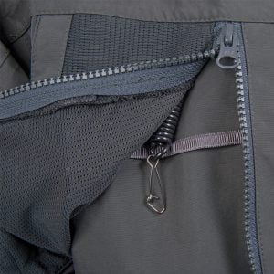 Að framan eru tveir rúmgóðir brjóstvasar sem nýtast undir fluguboxin og hliðum eru fóðraðir vasar fyrir hendur. Á vinstri hlið jakkans er flipi með gormi fyrir taumaklippur og losunartöng. Þá eru á jakkanum tveir möskva-pokar fyrir smádót og taumaefni.