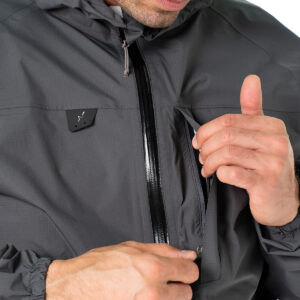 Framan á jakkanum er vatnsheldur YKK AquaGuard® rennilás með innri vörn sem kemur í veg fyrir að vatn komist inn. Brjóstvasinn er rúmgóður og með rennilás, hentugur fyrir flugubox eða aðra smáhluti. Á hægri öxl er flugupaddi með frönskum rennilás fyrir blautar flugur og á hálsbakinu er lykkja til að hengja háf.