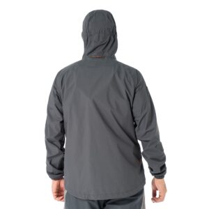 Jakkinn er einstaklega léttur, aðeins 275 grömm, og pakkast niður í eigin brjóstvasa, sem gerir hann auðveldan í geymslu og flutningi. Hettan er innbyggð og teygjanleg, hönnuð til að fylgja hreyfingum höfuðsins og veita skjól gegn veðri og skordýrum. Ermarnar eru með teygjanlegum endum og faldurinn neðst er stillanlegur með teygjusnúru, sem tryggir góða aðlögun að líkamanum.