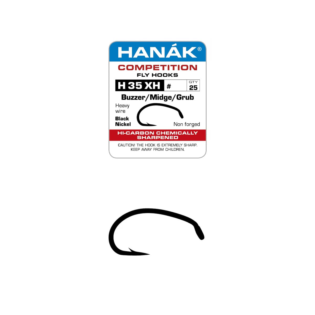 Hanak Barbed Buzzer H35 XH er öflugur hnýtingakrókur sem er sérstaklega ætlaður fyrir púpur og buzzera þar sem möguleiki er á stórum og kröftugum fiski. Krókurinn er smíðaður úr sterku Hi-Carbon stáli með þungum vír, sem veitir mikið öryggi í baráttunni og gerir hann jafnframt hentugan í veiðar í kyrru vatni.