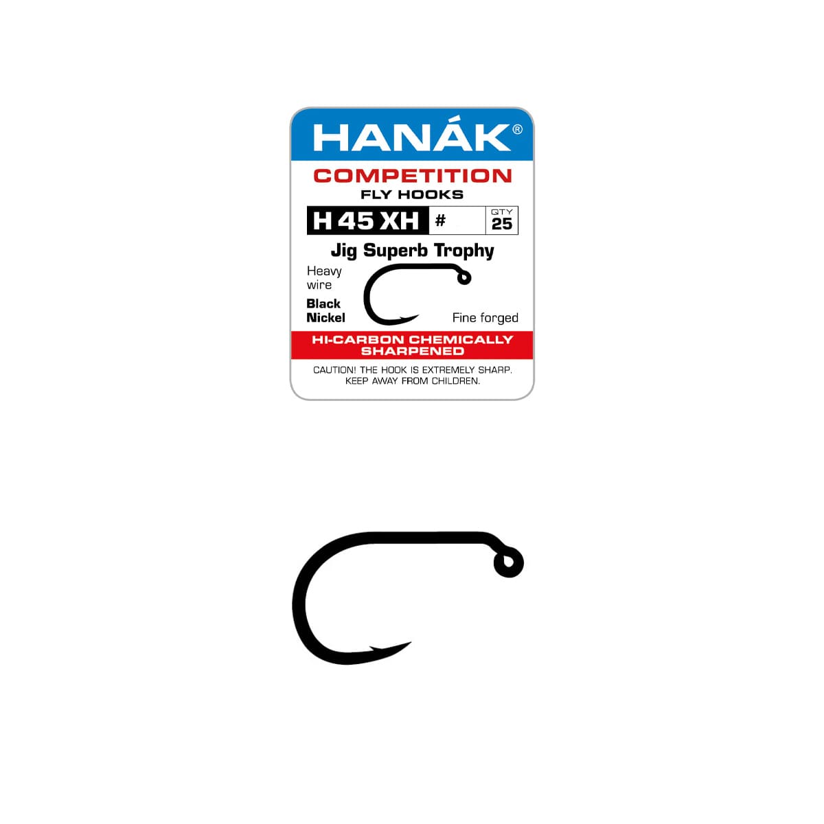 Krókurinn er með víðan bug sem tryggir framúrskarandi krókun, stuttan legg sem hentar vel í jig-púpur og langan, grannan og afar beittan odd sem fer hreint í munn fisksins. H45 XH er með agnhaldi, sem veitir aukið hald í baráttunni, en auðvelt er að klemma það niður ef óskað er eftir agnhaldslausri flugu.