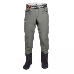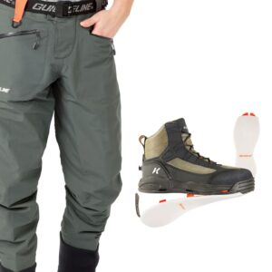 Þessi vöðlupakki samanstendur af flottum mittisvöðlum frá Guideline sem framleiddar eru úr þriggja laga nælonefni og góðum vöðluskóm. Vöðlurnar eru slitsterkar, með góðri vatnsvörn og hrinda um leið frá sér óhreinindum. Snið vaðlanna er úthugsað, hannað þannig að þær sitji sem best á notandanum. Bæði belti og mitti er teygjanlegt til auð auka þægindi og hreyfigetu. Mittisvöðlurnar eru með tvo vasa að framan með vatnsheldum rennilásum. D-lykkja er á beltinu sem hugsuð er undir taumaklippur og eða losunartöng. Þá eru á vöðlunum rennd buxnaklauf sem auðveldar veiðimönnum að fara í þær og úr. Sandhlífarnar og sokkarnir eru framleiddar úr sterku neoprene-efni sem tryggir betri endingu.