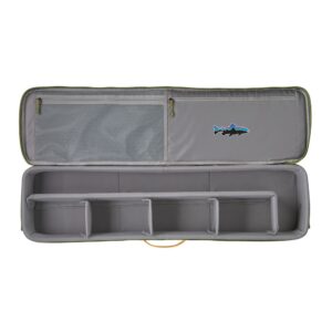 Inni í töskunni eru sérhönnuð hólf og skipulagskerfi sem tryggja að búnaðurinn sé vel varinn, aðskilinn og aðgengilegur. Ytra byrðið er úr endurunnu ripstop polyesteri með TPU-húðun og vatnsheldum rennilásum sem standast krefjandi aðstæður. Innra lagið er fóðrað og dregur úr hnjaski. Handfang og axlaról gera töskuna þægilega til flutnings, hvort sem er til og frá veiðistað eða á lengri ferðalögum.