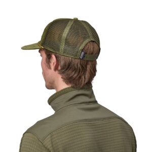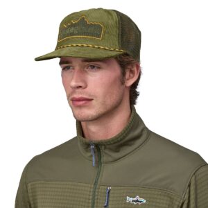 Falleg grænleit derhúfa frá Patagonia með útlínum fjalllendis að framanverðu. Húfan er með hárri krúnu (e. High Crown) og er framleidd úr lífrænni bómull og endurunnu pólýesterneti. Framan á derhúfuna má festa flugur í svokallaðan Fly Catcher. Varan er með Fair Trade vottun.