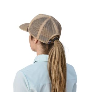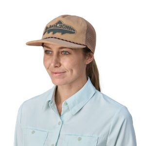 Ljósleit derhúfa frá Patagonia með útlínum fisks að framanverðu. Húfan er með hárri krúnu (e. High Crown) og er framleidd úr lífrænni bómull og endurunnu pólýesterneti. Framan á derhúfuna má festa flugur í svokallaðan Fly Catcher. Þessi vara með Fair Trade vottun.