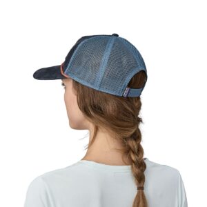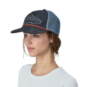Dökkblá derhúfa frá Patagonia með útlínum fisks að framanverðu. Húfan er með hárri krúnu (e. High Crown) og er framleidd úr lífrænni bómull og endurunnu pólýesterneti. Framan á derhúfuna má festa flugur í svokallaðan Fly Catcher. Varan er með Fair Trade vottun.