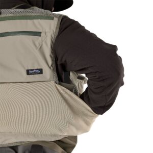 - Geymsla: Vestið býður upp á tvo rennilásavasa að aftan með möguleika á vökvakerfi, tvo stóra fluguboxavasa, fjóra lóðrétta vasa og einn vasa fyrir flotefni.