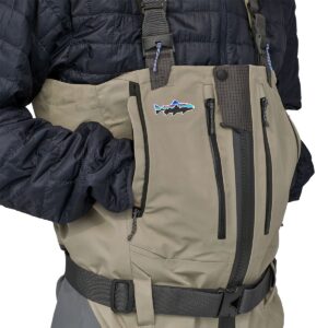 Vöðlurnar eru renndar með níðsterkum YKK-rennilás sem er 100% vatnsheldur og stenst álagið við mikla notkun. Hæð vaðlanna má stilla með einföldum hætti, t.d. má færa þær neðar á heitum sumardögum. Tveir rúmgóðir vasar eru utan á vöðlunum, báðir með vatnsvörðum rennilásum. Á hliðum eru fóðraðir vasar fyrir kaldar hendur. Vöðlubeltið er ú teygjanlegu efni sem situr í slíðrum, til varnar því að beltið færist úr skorðum. Að innanverðu er tvöfaldur vatnsheldur poki sem velta má fram, og er ætlaður undir síma og bíllykla. Í þeim rúmast einnig flugubox eða ýmiss veiðitól.