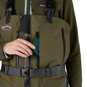 Vatnsheldur YKK® rennilás að framan gerir það einstaklega þægilegt að fara í og úr vöðlunum og að klæðast þeim með lögum undir eftir aðstæðum. Stillanleg axlabönd með smellum gera auðvelt að breyta þeim úr uppháum í mittisvöðlur. Secure Stretch™ vöðlubelti ásamt beltilykkjum að framan og aftan tryggja örugga og þægilega aðlögun.