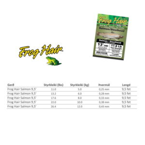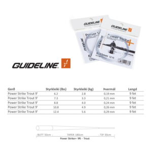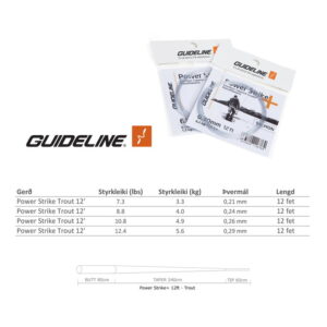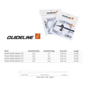 Power Strike Salmon eru frammjókkandi taumar frá Guideline hannaðir í laxveiðina. Taumurinn er meðalstífur en virkilega þjáll og nýtist í öllum veðuraðstæðum, logni sem miklum vindi. Taumarnir eru afar sterkir m.v. sverleika, þeir eru glærir með örlitlum gráum tóni til að tryggja minni sýnileika í vatni.