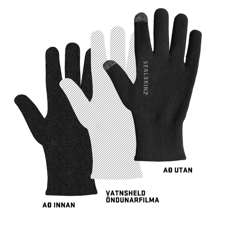 Notalegir 100% vatnsheldir hanskar frá Sealskinz með sömu einstöku tækninni og fyrirtækið notar í framleiðslu vatnsheldra sokka. Hanskarnir eru hlýir og þægilegir og henta vel við fjölbreyttar aðstæður. Þeir eru með góðu gripi og halda höndunum þurrum í rigningu og snjó án þess að hefta hreyfingu þeirra.