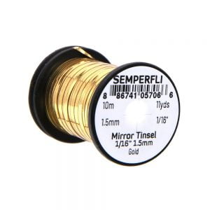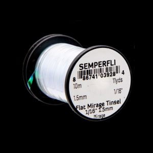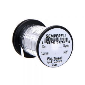 Flatt mirror tinsel frá Semperfli sem er það breiðasta sem fyrirtækið framleiðir. Efnið má nota í stærri púpur, straumflugur og laxaflugur. 10 metrar efnisins eru á hverju kefli og er breidd þess 1,5mm (1/16″).