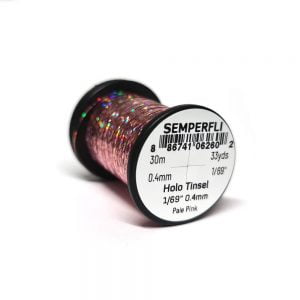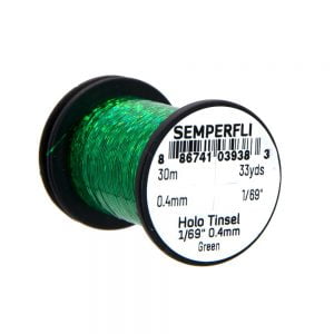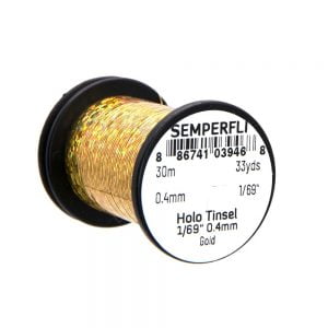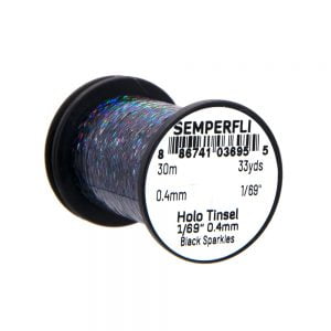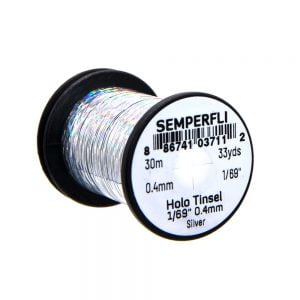 Holographic Tinsel Small er fíngert tinsel frá Semperfli. Megin munurinn á holographic tinseli og hefðbundnu er sá að það fyrrnefnda er með hamraðri áferð. Efnið er aðeins 0,4mm (1/69″) á breidd sem er heppilegt til hnýtinga á smærri flugum, s.s. púpum og litlum straumflugum auk smáflugna í laxinn. 30 metrar eru á hverju kefli og er tinselið fáanlegt í nokkrum litum.