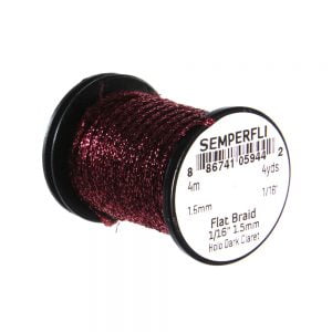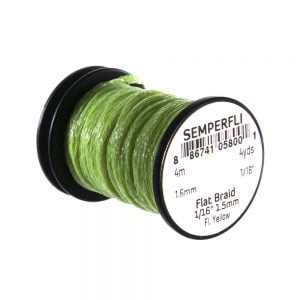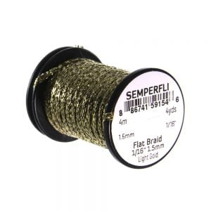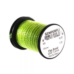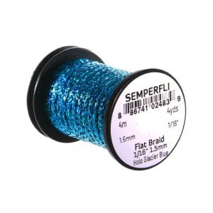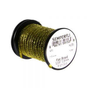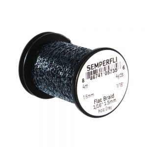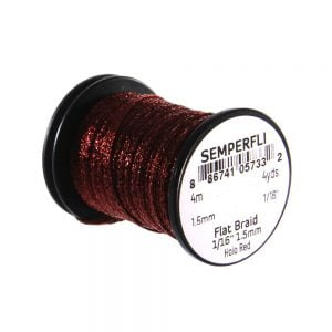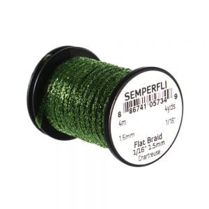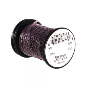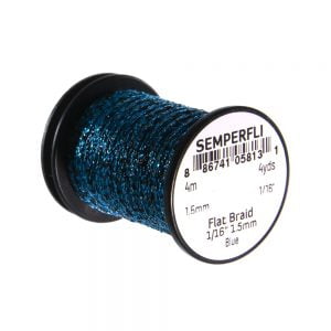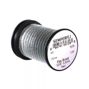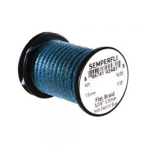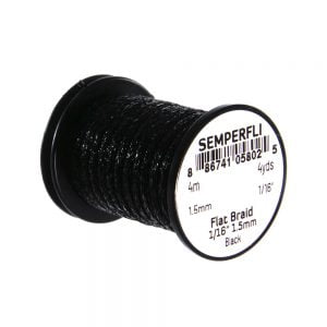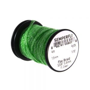 Flat Braid er glitrandi fléttuband sem nýtist á margan hátt. Það hentar sem búkefni í túpur eða í hverskonar straum-, saltvatns- og laxaflugur. Einnig er hægt að greiða úr fléttunni og nota sem stél eða væng. Efnið er einkar sterkt og þægilegt notkunar. Sé teygt á efninu verður það þynnra en með minna átaki dreifir það úr sér. Því er hægt að framkalla ólíka ásýnd eftir því hvernig efninu er vafið. Flat Braid er 1,5mm að þykkt og er fáanlegt í 24 mismunandi litum. Fjórir metrar á hverju kefli.