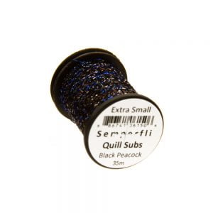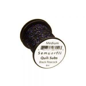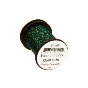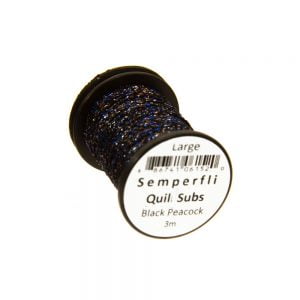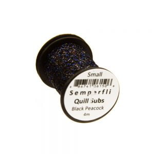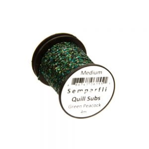 Peacock Quill er staðgönguvara hefðbundinna peacock-fana. Efnið er gætt marglita litbrigðum líkt og náttúrulegur peacock og gerir hnýtingarnar fljótlegri og þægilegri. Peacock Quill er fáanlegt í fimm mismunandi þykktum og tveimur litum: svörtum og grænum. Um þrír metrar af þessu skemmtilega efni eru á hverju kefli.