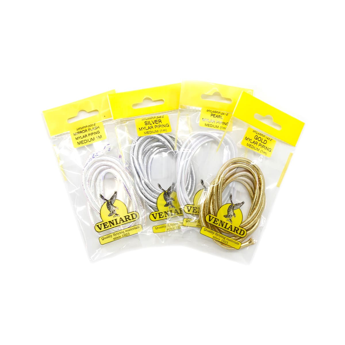 Mylar Piping frá Veniard er fléttað tinsel-efni sem er ætlað sem búkefni á stærri flugur. Efnið er þrætt upp á túpur eða stærri einkrækjur og myndar sléttan, jafnan og glansandi búk sem sést vel í vatni.